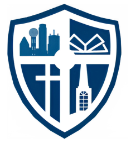 Dallas Bible Theological Institute logo featuring a city skyline, a book, a cross, and a church steeple, with blue and white colors and the founding year 1943.